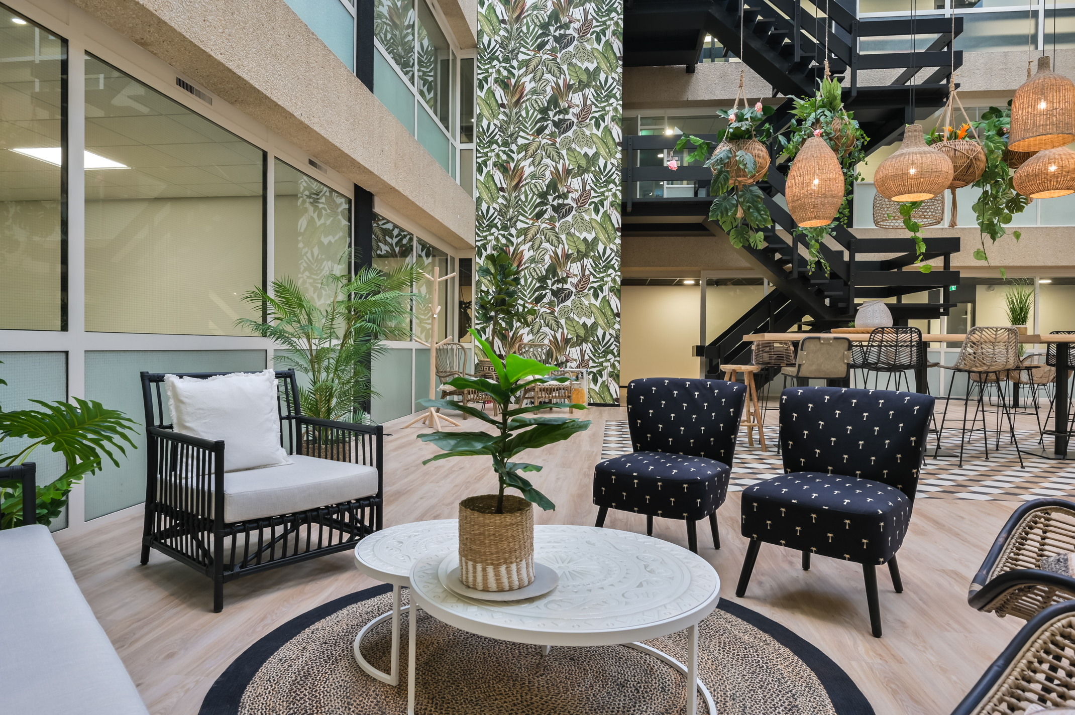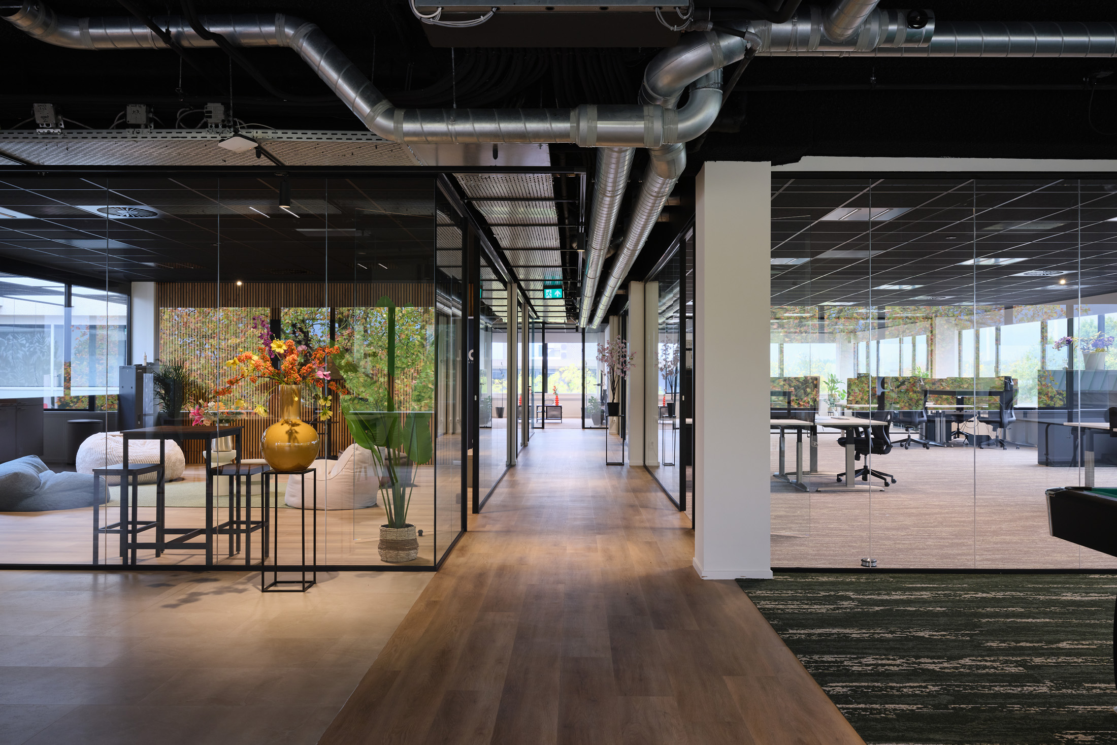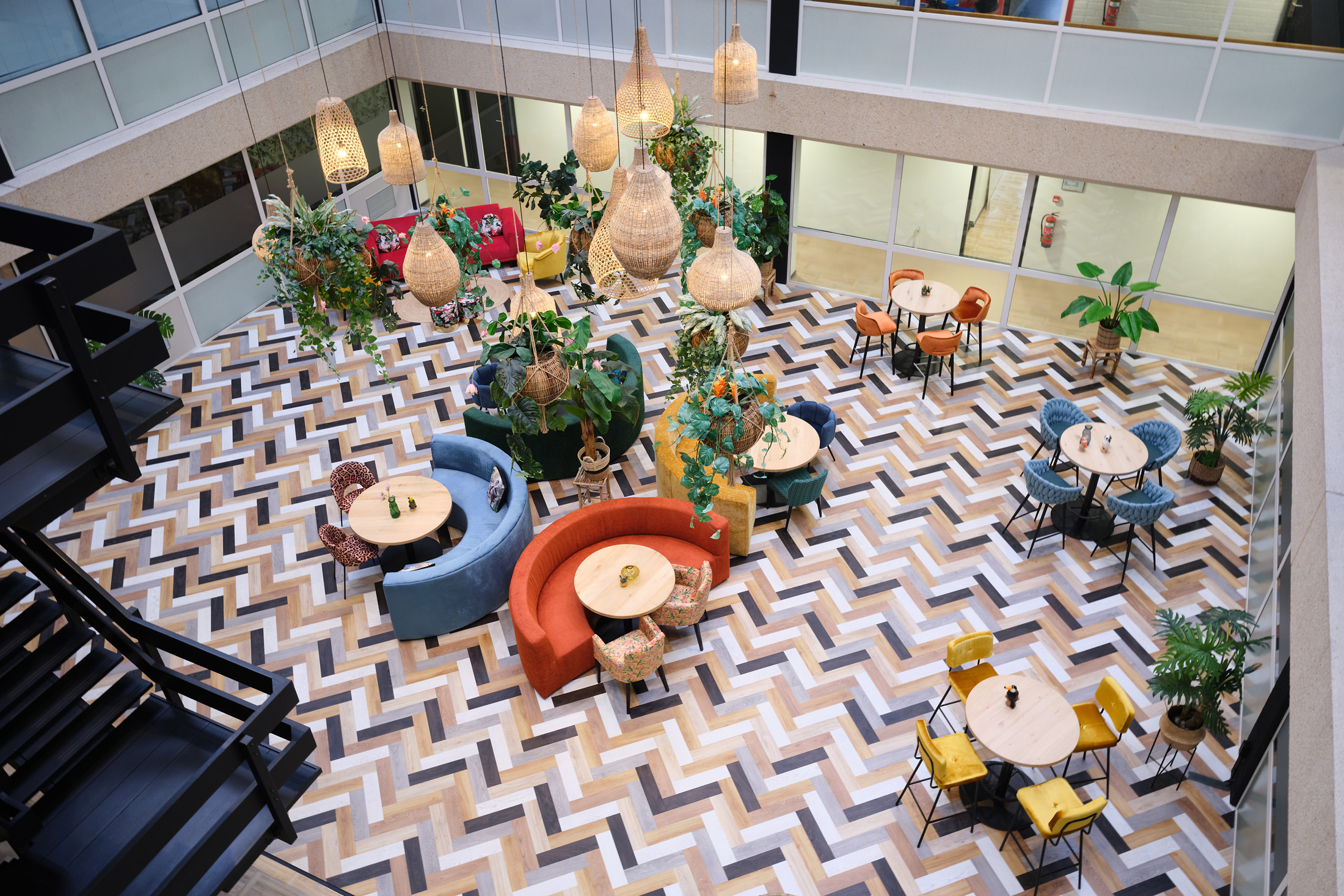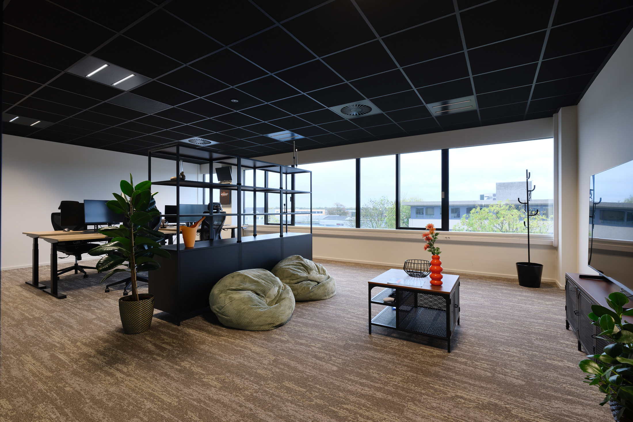 De huurder van de 2e verdieping kan gebruik maken van de faciliteiten op de begane grond, zoals de gemeenschappelijke vergaderruimten en de loungeplekken in de binnentuinen.