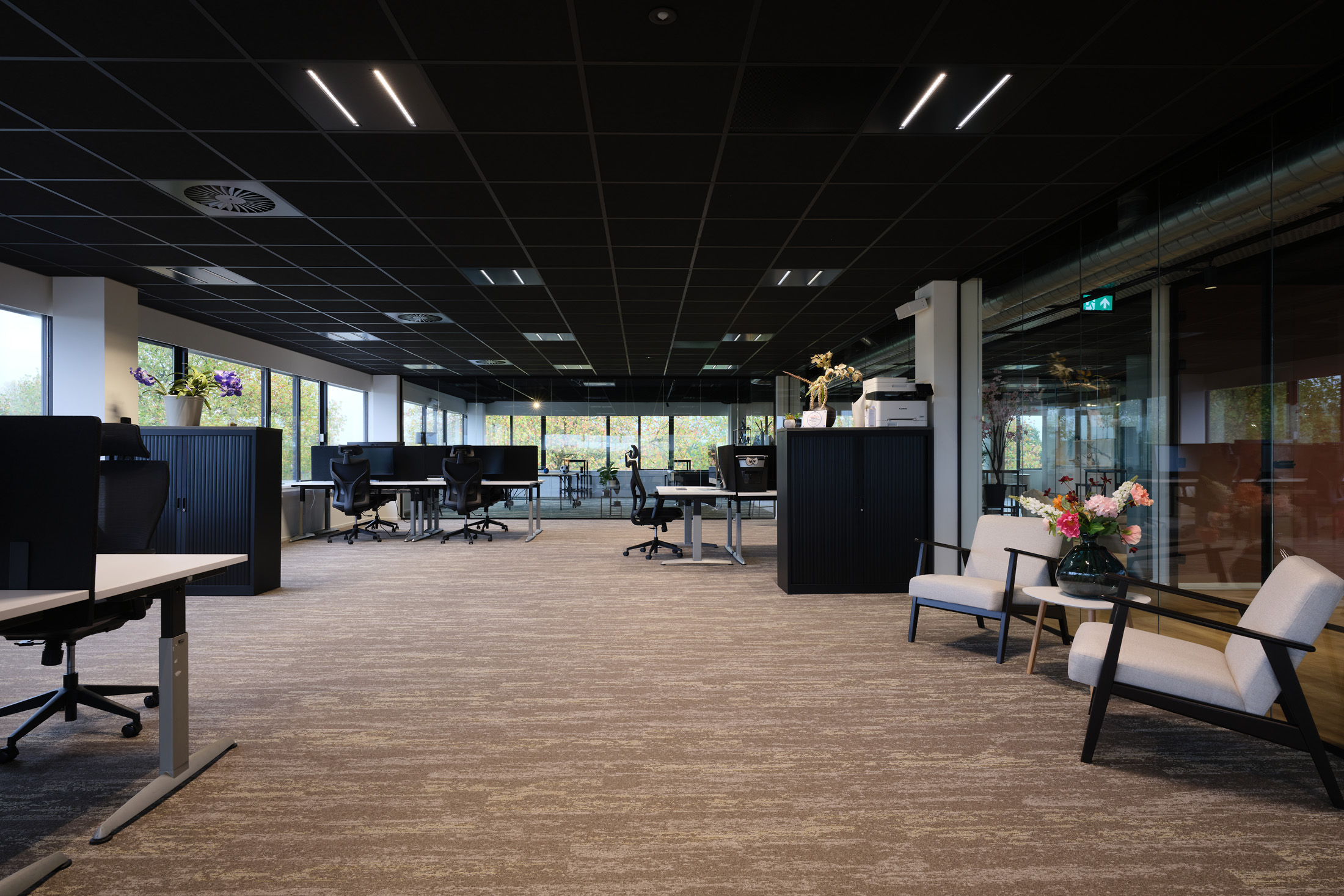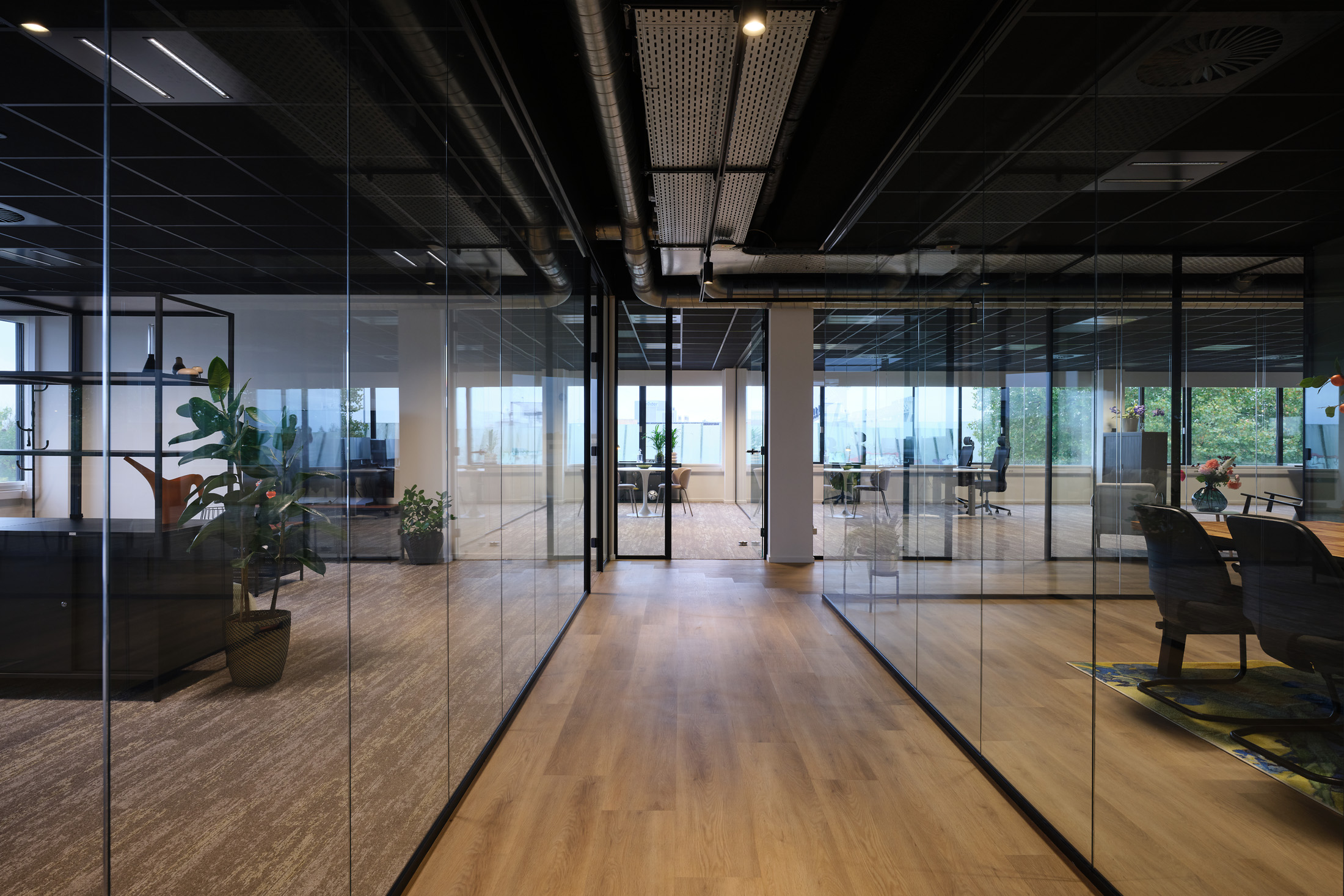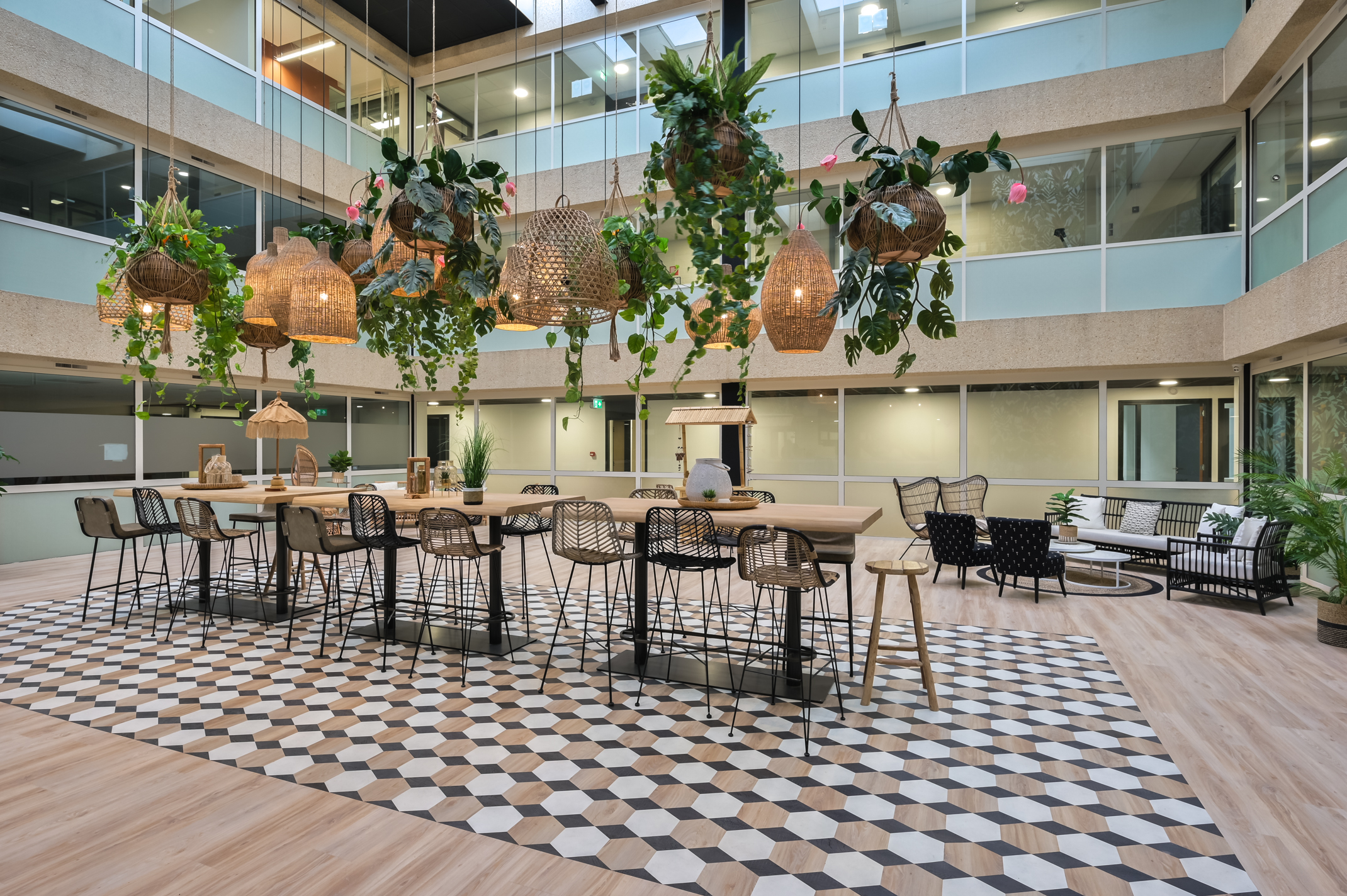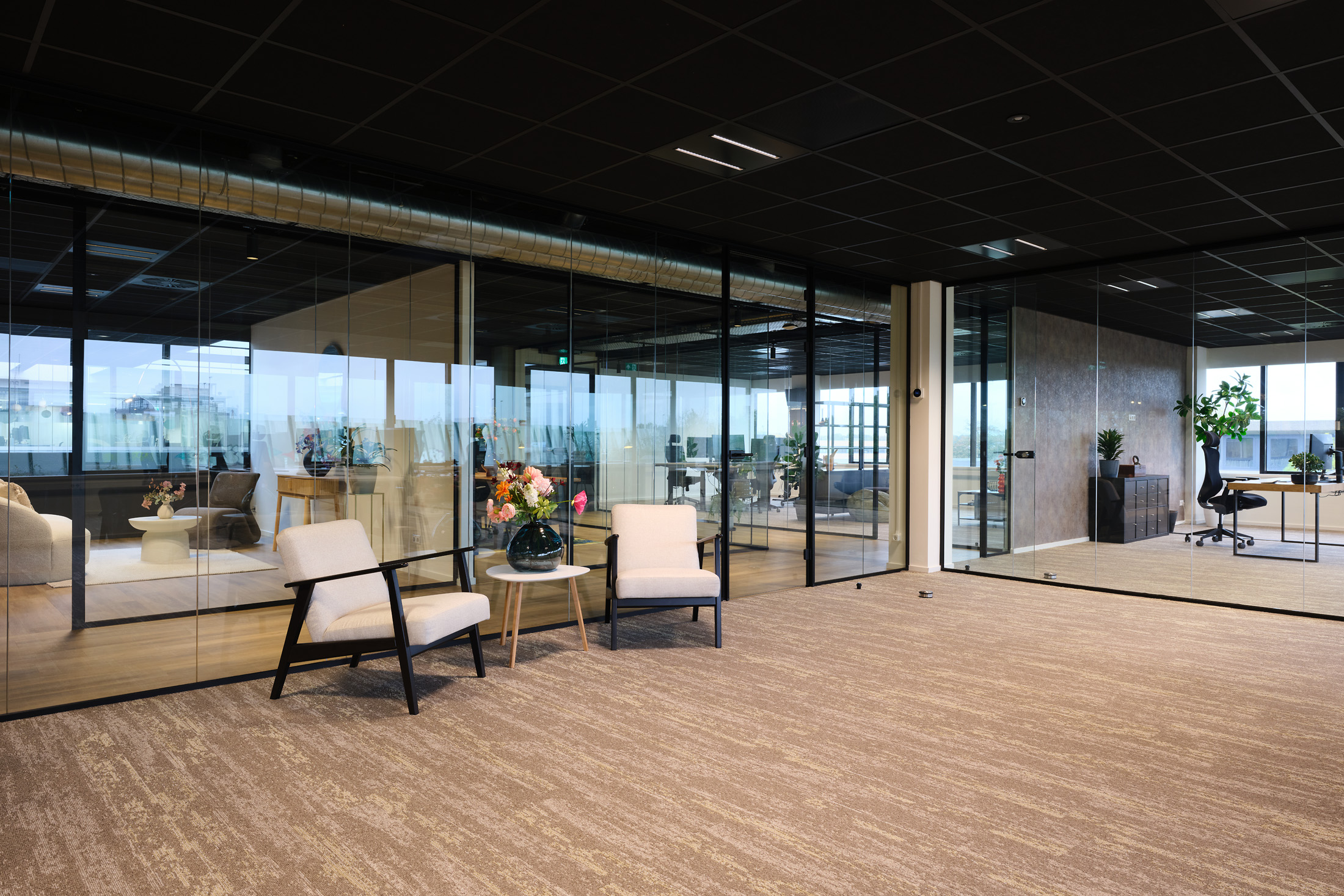 De huurder van de 2e verdieping kan gebruik maken van de faciliteiten op de begane grond, zoals de gemeenschappelijke vergaderruimten en de loungeplekken in de binnentuinen.