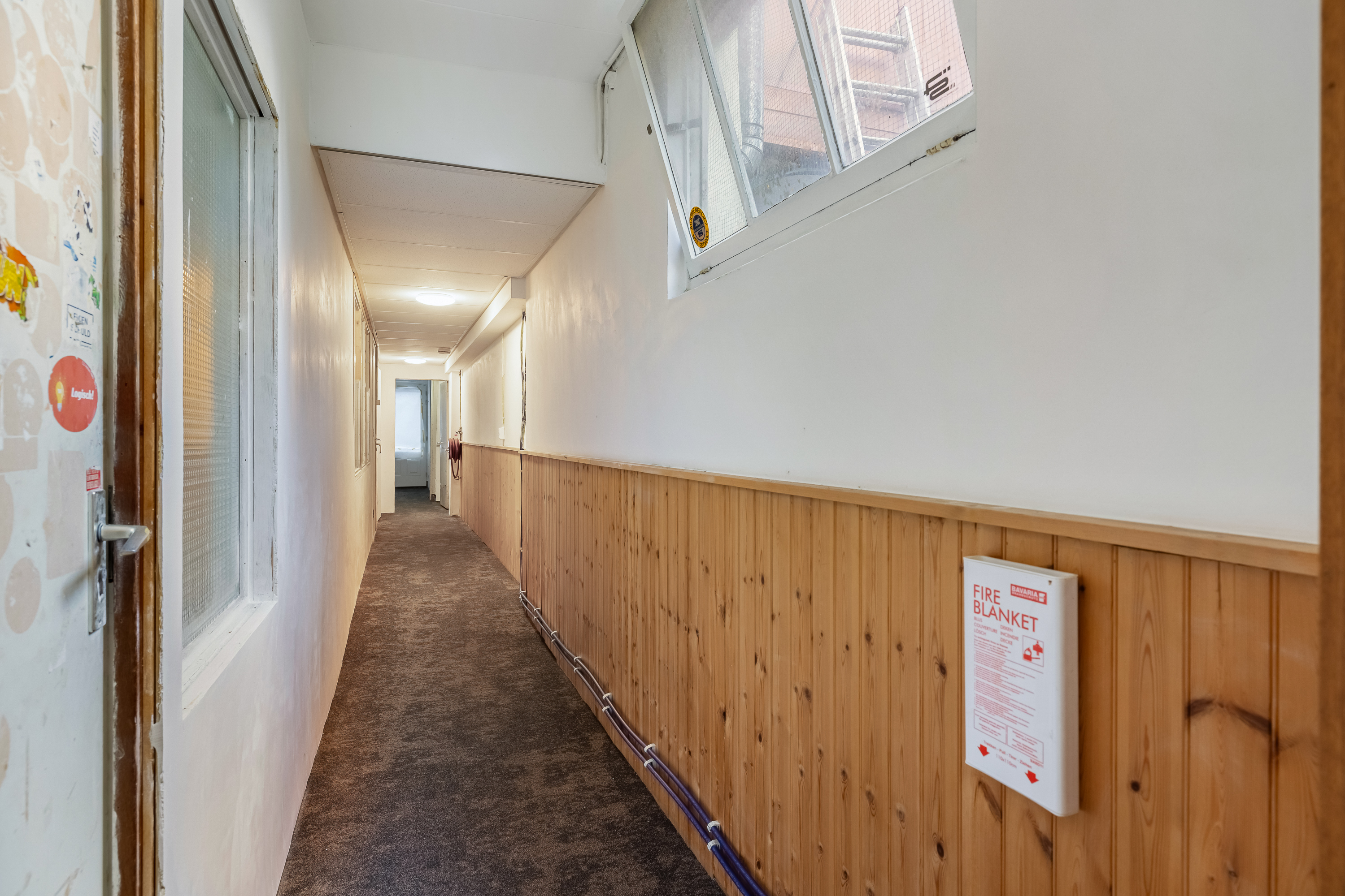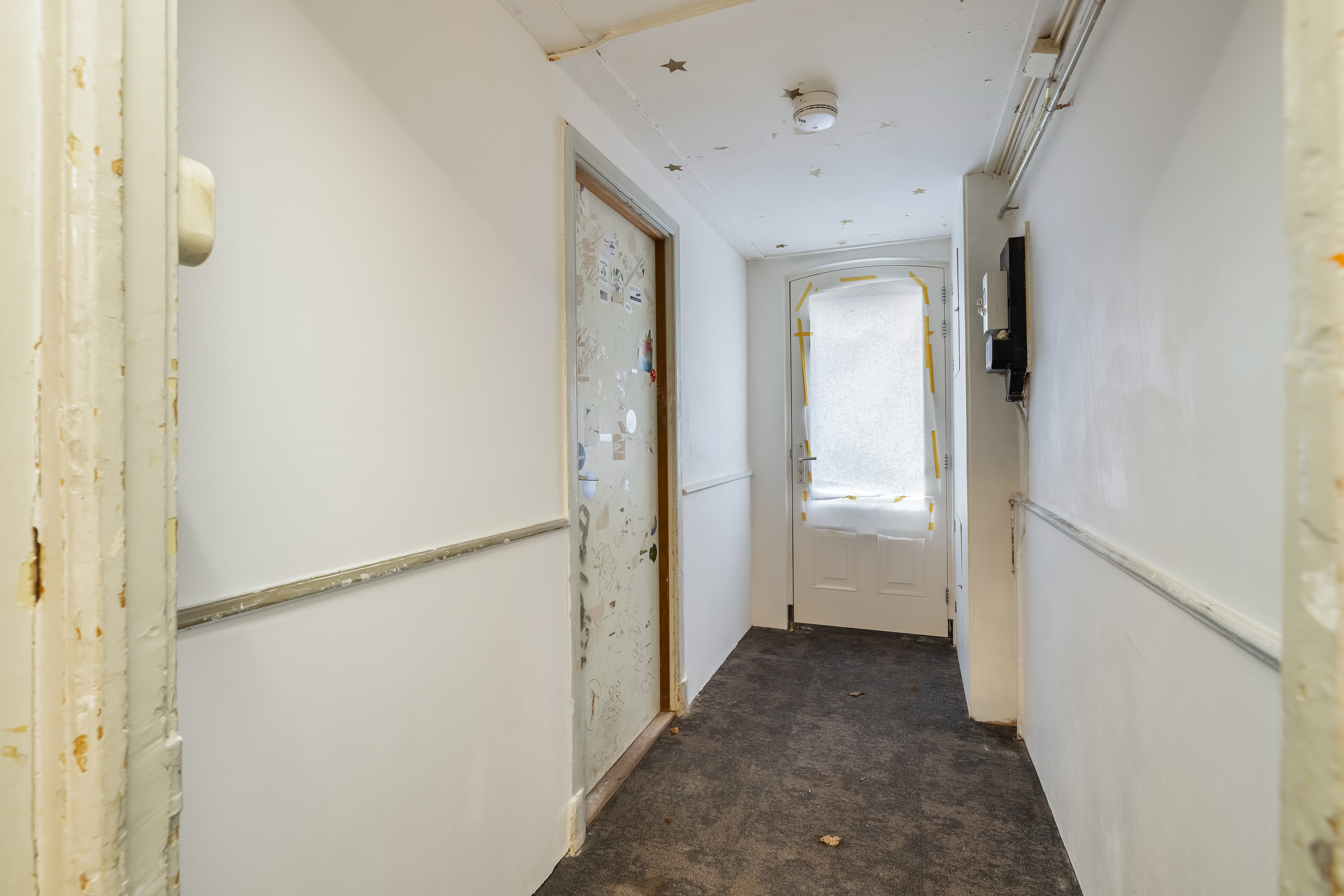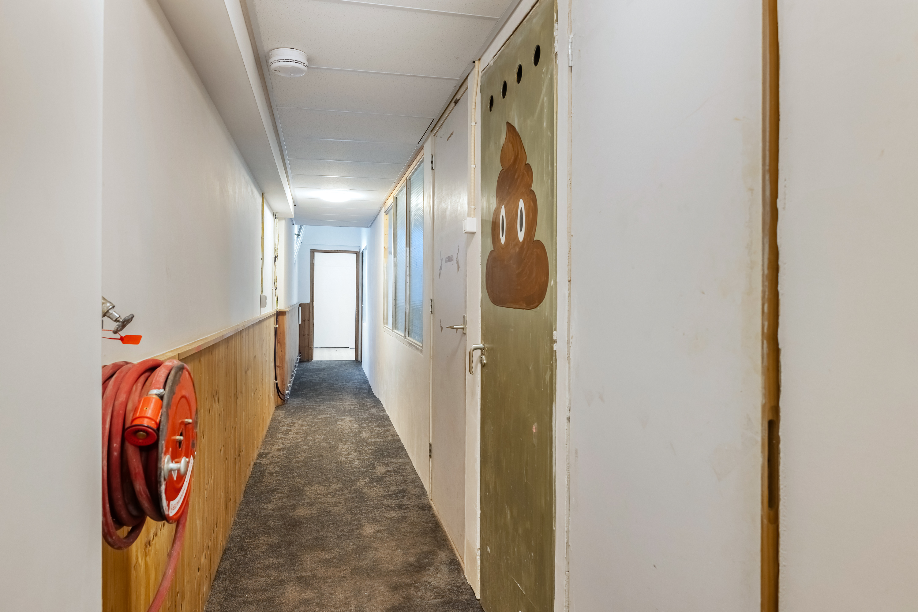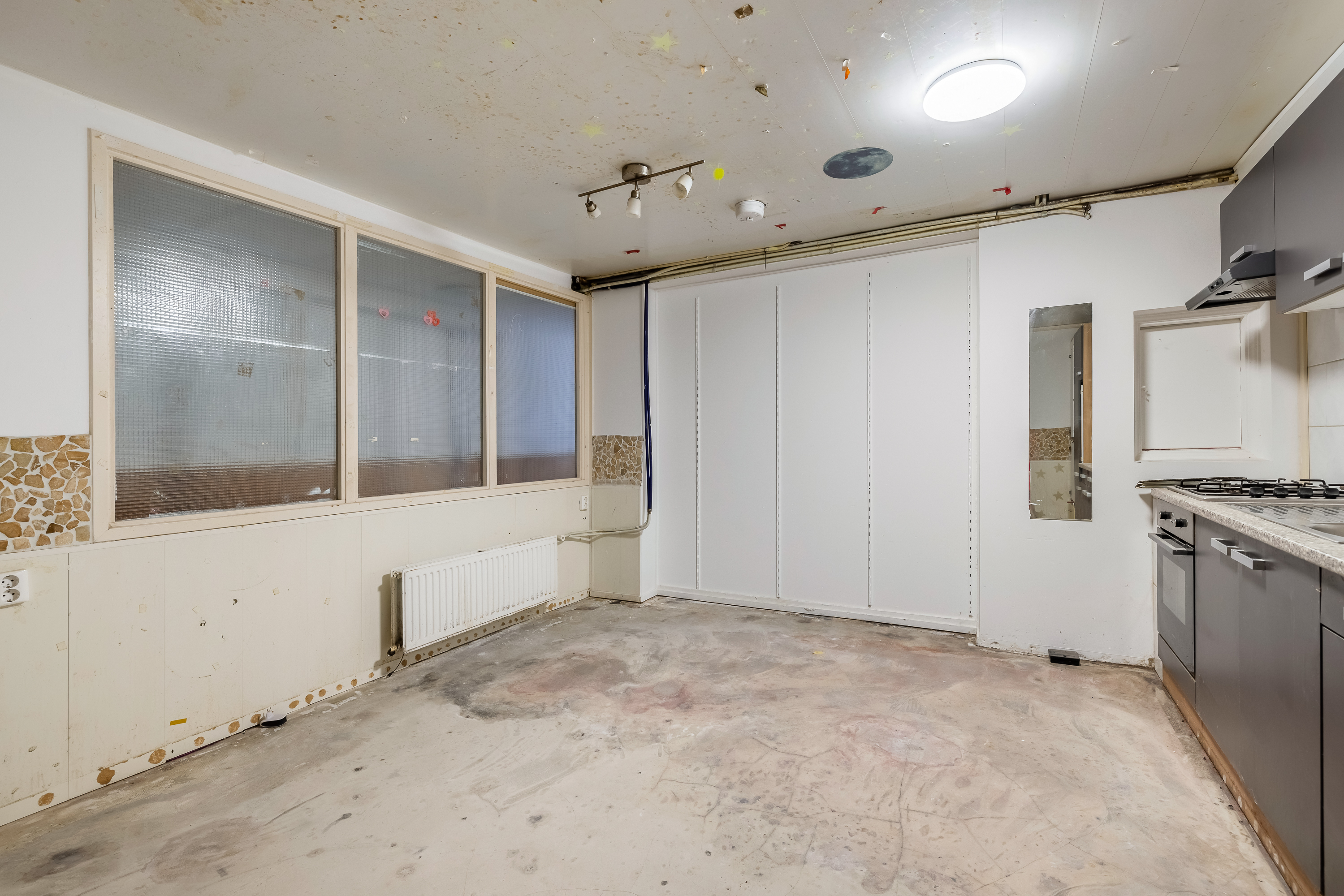 Op dit moment bestaat de begane grond uit een lange hal, drie (slaap)kamers, een keuken, een badkamer en een toilet.